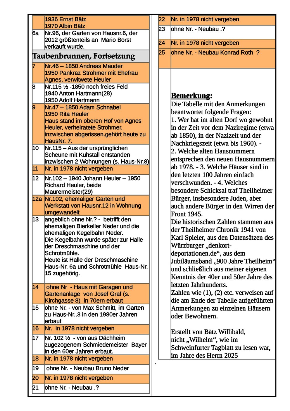 (25a) Johann Bätz, verheiratet mit Barbara Barth wohnte um 1900 mit den Kindern Maria (verh. Neder), Ernst, Emilie (verh. Stumpf) und Aquilin in der heutigen Erthalstraße Haus-Nr. 6. Nach dem frühen Tod von Barbara (im Kindsbett), kaufte er das Judenhaus in heute Taubenbrunnen 2.